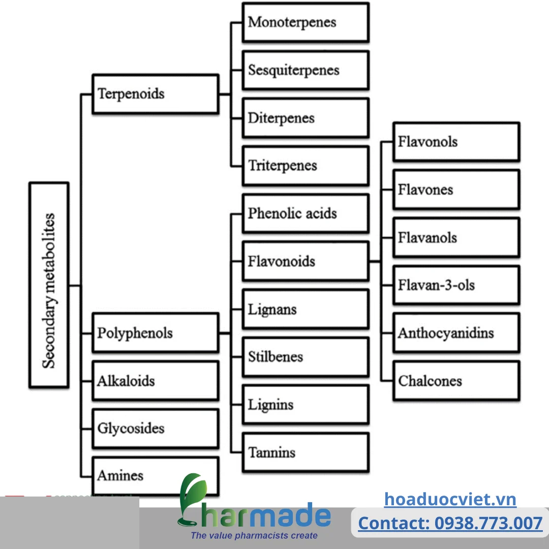 Có một thuật ngữ chung cho các thành phần thực vật này là phytochemical, những chất này chịu trách nhiệm tạo ra đặc tính chữa bệnh của chiết xuất dược liệu. Trong số những chất chuyển hóa thứ cấp, polyphenols, terpenoids, alkaloids, lectins, polypeptides, và polyacetylenes đã được biết là có hoạt tính tốt. Hầu hết những chất này đều được chấp thuận như là một chất nhìn chung là an toàn (generally recognized as safe (GRAS)) cho thực phẩm. Việc phân loại các chất chuyển hóa thứ cấp trong chiết xuất dược liệu có thể được dựa trên cấu trúc hóa học, thành phần, độ hòa tan trong các dung môi hoặc theo con đường chúng được tổng hợp. Hiện nay người ta chủ yếu phân loại các thành phần có hoạt tính này theo sơ đồ bên dưới, dựa trên cấu trúc hóa học của chúng.